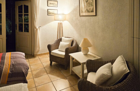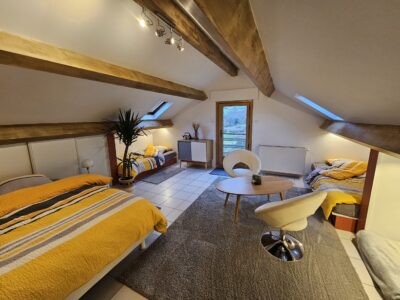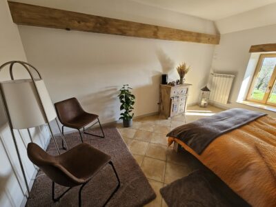 Notre chambre familiale, la Chambre des Chênes, est la plus spacieuse avec un grand lit et deux lits en alcôves (90 x 190). Parfaite pour les familles, elle accueille également les chiens via un escalier extérieur privatif. Entièrement rénovée, elle dispose d’une salle de bain privée complète avec lavabo, douche et WC.